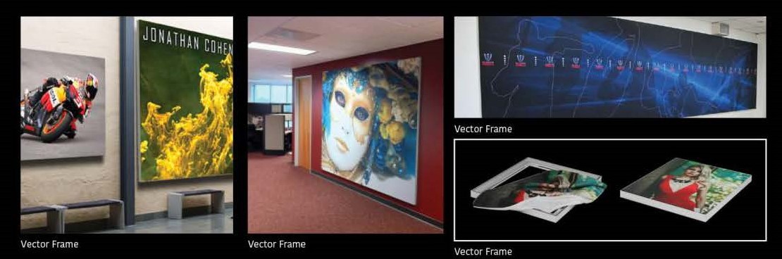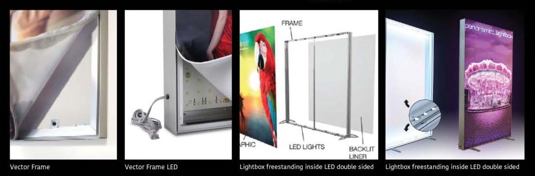 Les cadres en tissus tendus muraux (Vector Frame Edge) combinent une extrusion légère en aluminium de 3/4 de pouce. Des cadres et des graphiques de tissu push-fit faciles à appliquer. Les cadres en tissus tendus autoportant et/ ou retro-éclairés (Vector Frame self standing fabric Light Boxes) ajoutent de la lumière aux environnements de ventes au détail, aux salons professionnels et aux événements. Ils disposent d'un éclairage à bande LED pré-attaché au cadre pour faciliter le montage. Les cadres d'extrusion sont faciles à assembler et sont proposés avec des impressions simples ou double-faces, et sont emballés facilement pour une portabilité ultime. Muraux, Autoportant ou retro-éclairés, tous garantissent un rendu surprenant de votre message.