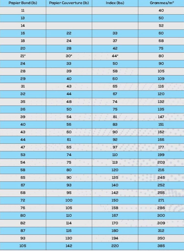 - 200 - 250g/m2 ou 53.3 - 66.6lbs Impression sur le recto/verso